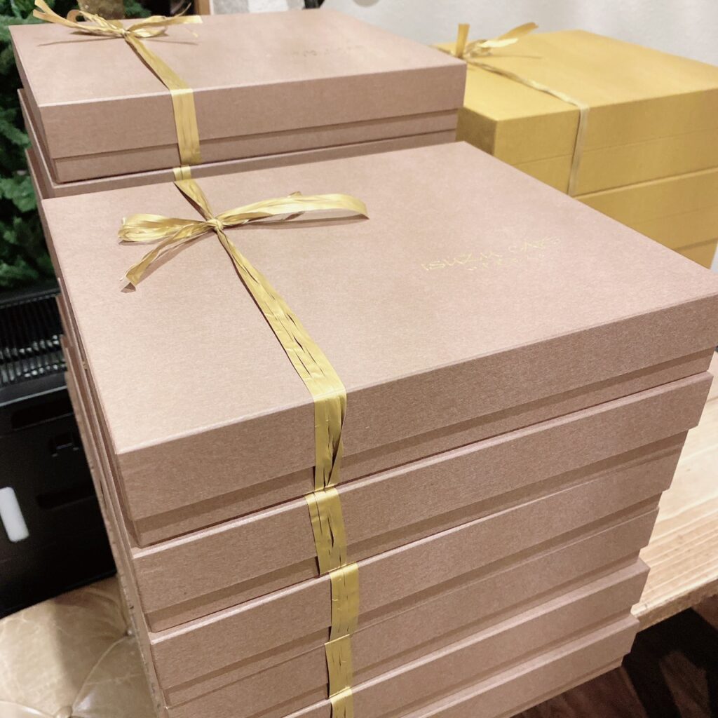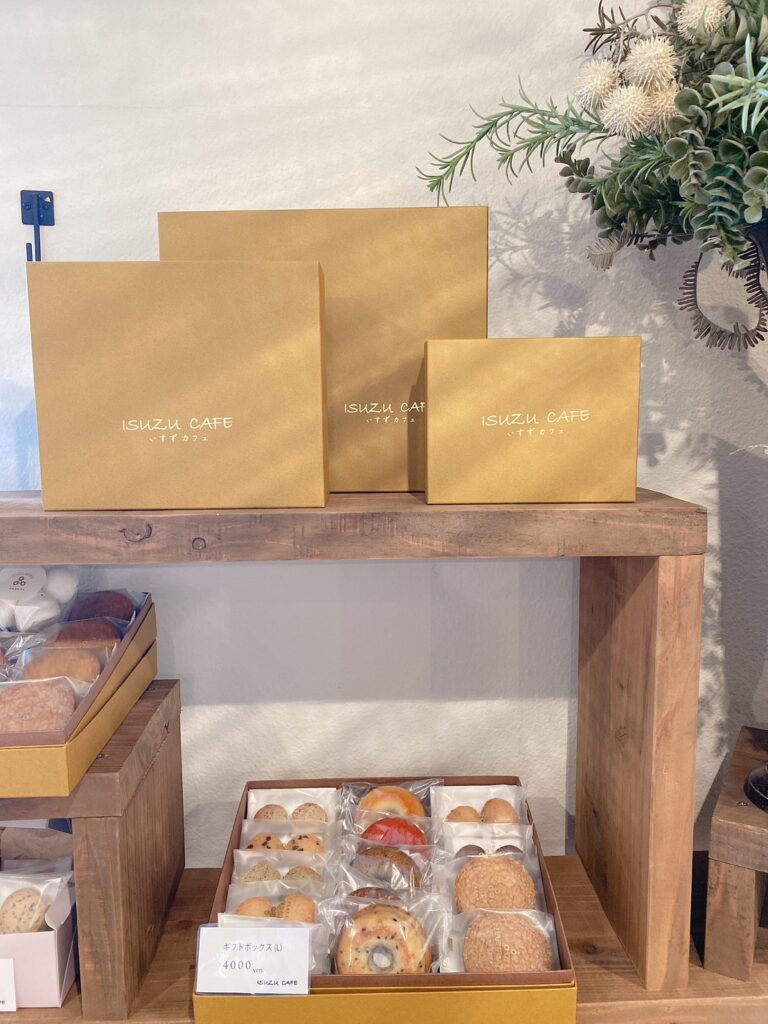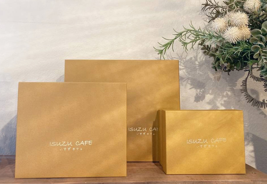 いすずカフェ大人気の焼き菓子を詰め合わせたギフトボックスをご利用いただいております。重厚感のあるカラーとゴールドの箔押しで、シンプルかつ素敵な仕上がりに好評です。